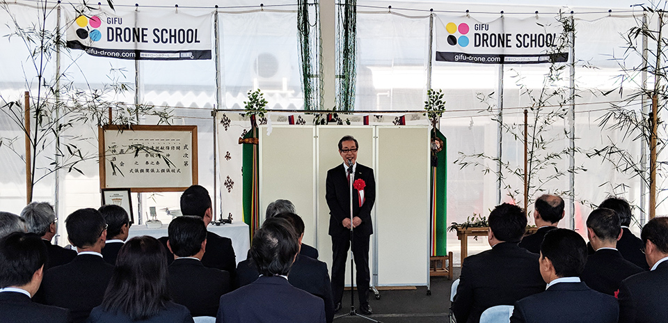 主賓来賓のご挨拶、ご紹介の後、弊社ドローンスクール担当の田中より岐阜ドローンスクールの説明が行われました。