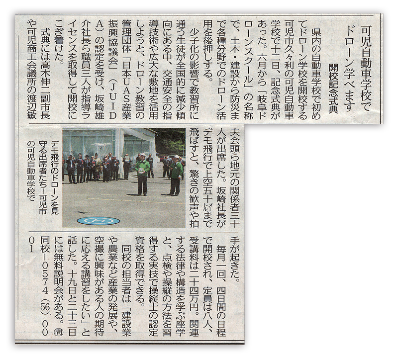 開校式典が中日新聞・岐阜県版に掲載 2018年5月13日 User_gifudrone 5月13日(日)の中日新聞・岐阜県版に岐阜ドローンスクール、安全祈願祭及び開校式典の記事が掲載されました。 市役所や農協、消防など非常に多くの方に参加していただきました。 岐阜ドローンスクールは、今後地域からの期待に答えられるよう、そして、ドローンの普及に貢献できるように尽力したいと思います。