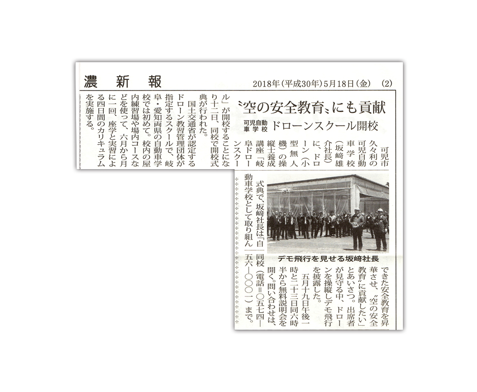 2018年5月18日 東濃新報社にドローンスクール開校式典に関する記事が掲載されました。