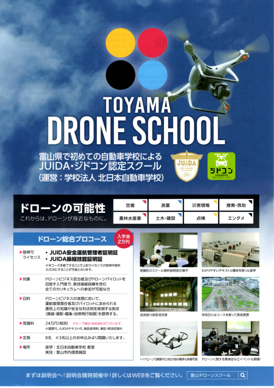 チラシの写真がありますが、富山ドローンスクールさんの第1期は9月らしく、今は立ち上げ準備中です。ご質問などございましたら、直接北日本自動車学校までお問い合わせください。