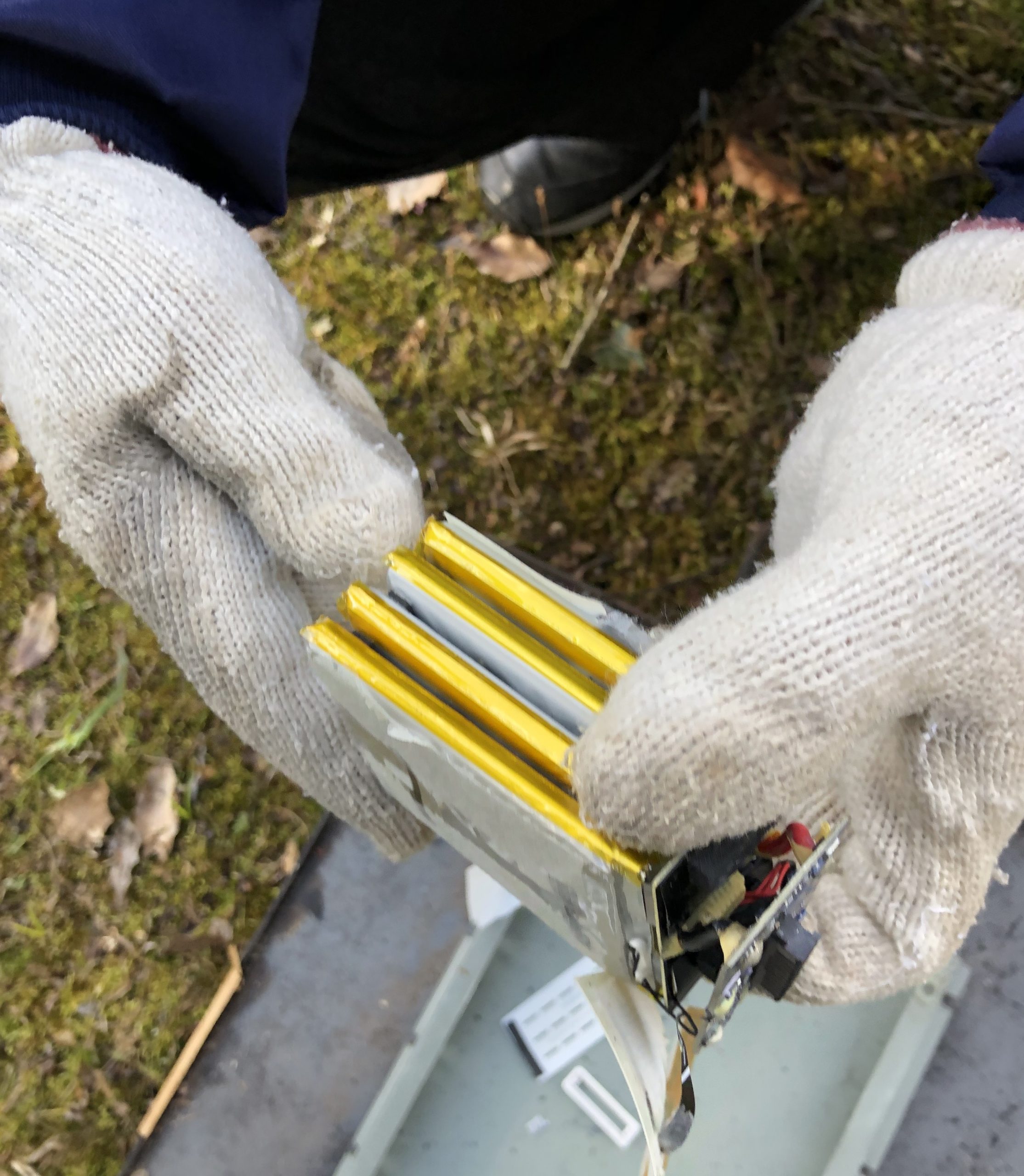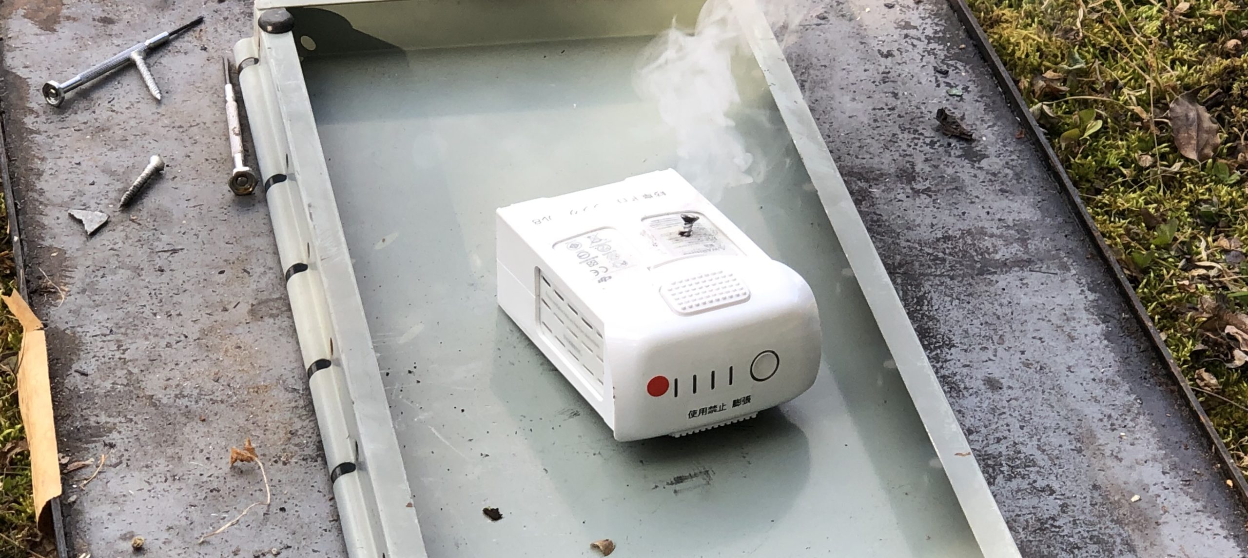 リポバッテリー燃焼実験その② 2022年2月10日 User_gifudrone ということで、続きです。 二つ目のバッテリーに穴を開けてみることに! 次こそは成功?してくれと思い、慎重に釘を打ち付けると、、、 最初は反応無かったのですが、暫くすると 煙が出てきました!! その後、しっかり煙が出てきました!煙が収まったので、禁断の死亡解剖を!笑 中身はこんな感じでした笑 最終的にはバラバラになったので、塩水につけてお墓に納めました。 勉強になりましたね笑