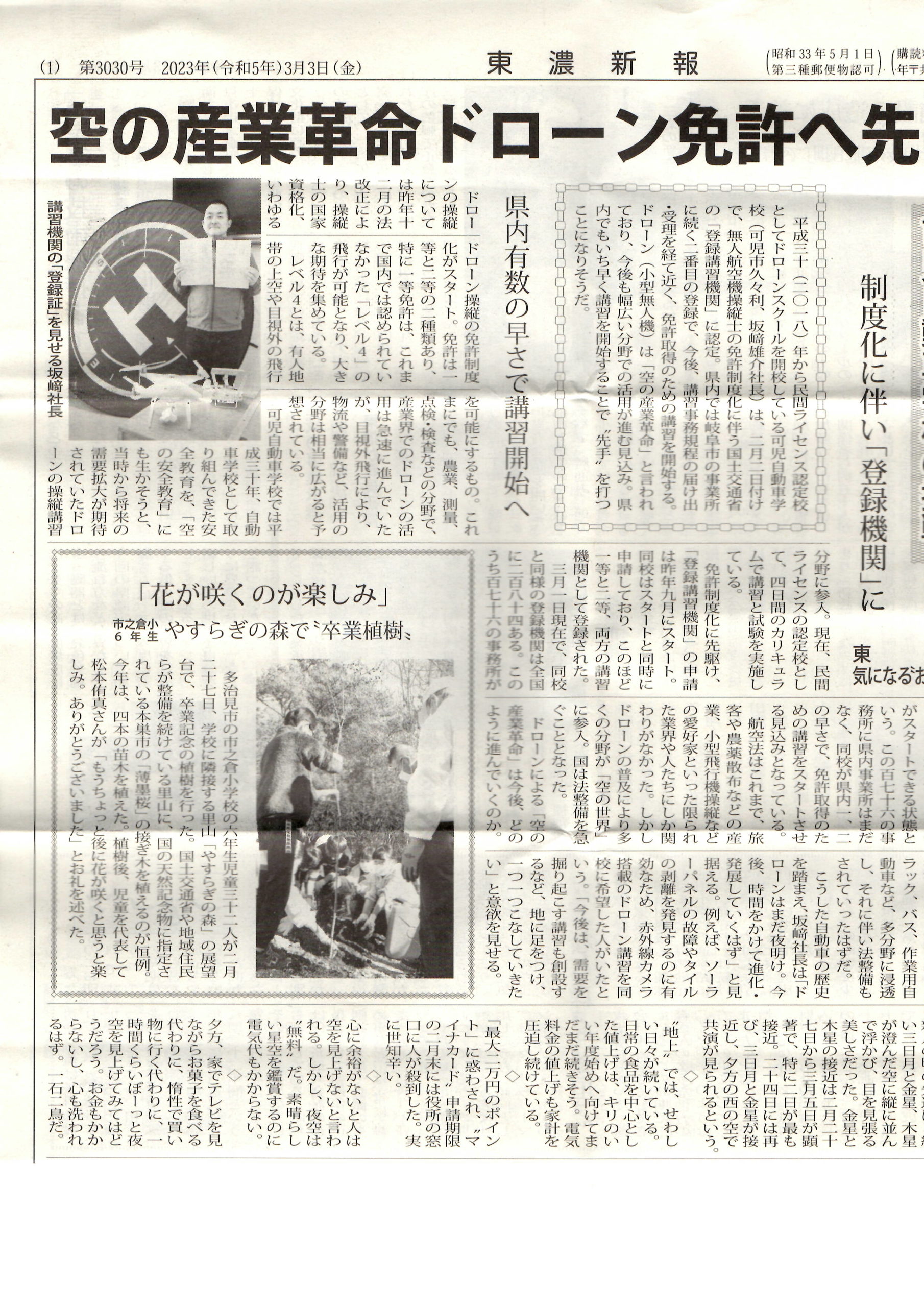 東濃新報に掲載されました!! 2023年3月11日 User_gifudrone 岐阜県の東濃地区を中心とした新聞社である「東濃新報」さんの記事になりました!! 忙しい時間を縫ってわざわざお越しいただき取材を受けたのですが、緊張ですね。。。苦笑 にしても、一面にしっかりと記載されているとは。。。 やっぱり新聞記者さんって話が上手いというか、質問の仕方が鋭いというか、改めて情報収集能力が高くて凄いなーと感じました笑い 期待に応えられるようなんとか間に合わせられるよう頑張ります!